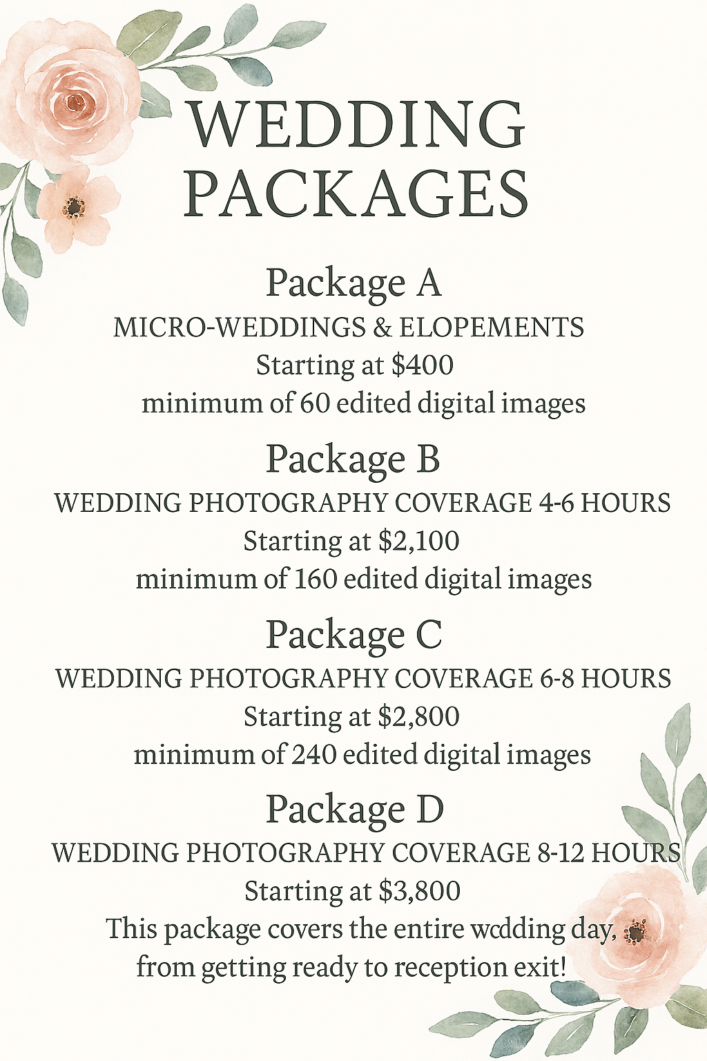 All sessions outside of Weddings and Large Events are Billed at $350 per hour.